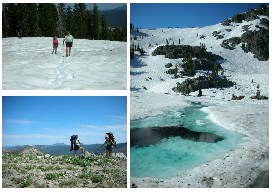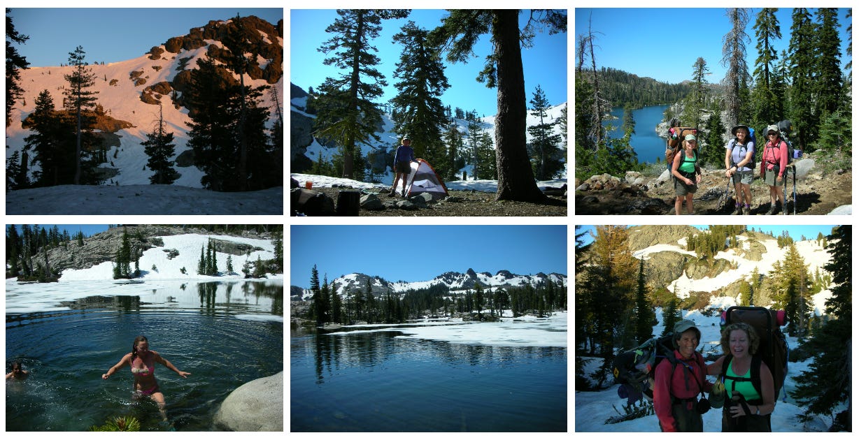 I’d forgotten I even had these photos, but discovered them recently in the recesses of my old computer files. I thought you might enjoy them. In June of 2006, Cappy and I set out for a three-day, two-night backpacking trip into Grouse Ridge Basin area of the Northern Sierra Nevada. Jane joined us for day one only, while our friend Patty came along for the whole weekend. We hiked in past Carr and Feely and Island Lakes, all the way to Glacier Lake. There was still a lot of snow on the trail, so we did a lot of “dead reckoning” on the way in. We found tiny Glacier Lake almost completely frozen over and a small stash of beer buried in the snow by some previous hikers. We set up camp at Glacier, and did day hikes out to Six Lake Basin the next day, where Cappy and Patty insisted on swimming with the icebergs! Not me!